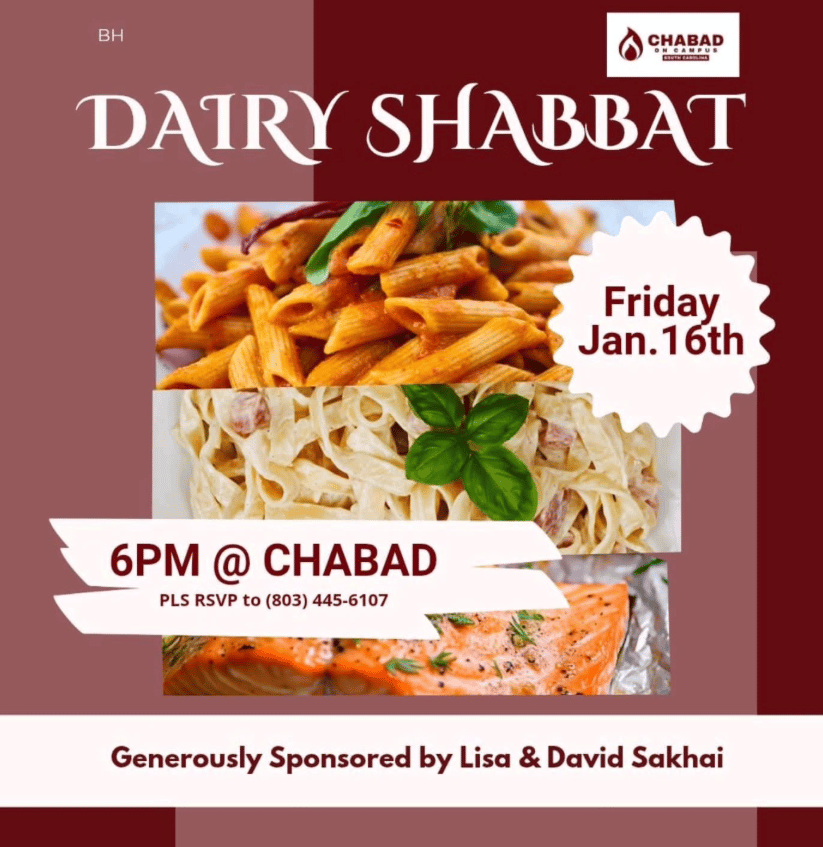 Friday Jan 16th we hosted a unique “Dairy” Shabbat, featuring a full dairy menu. Generously sponsored by the Sakhai Family in honor of the birthday of their daughter Jessie!